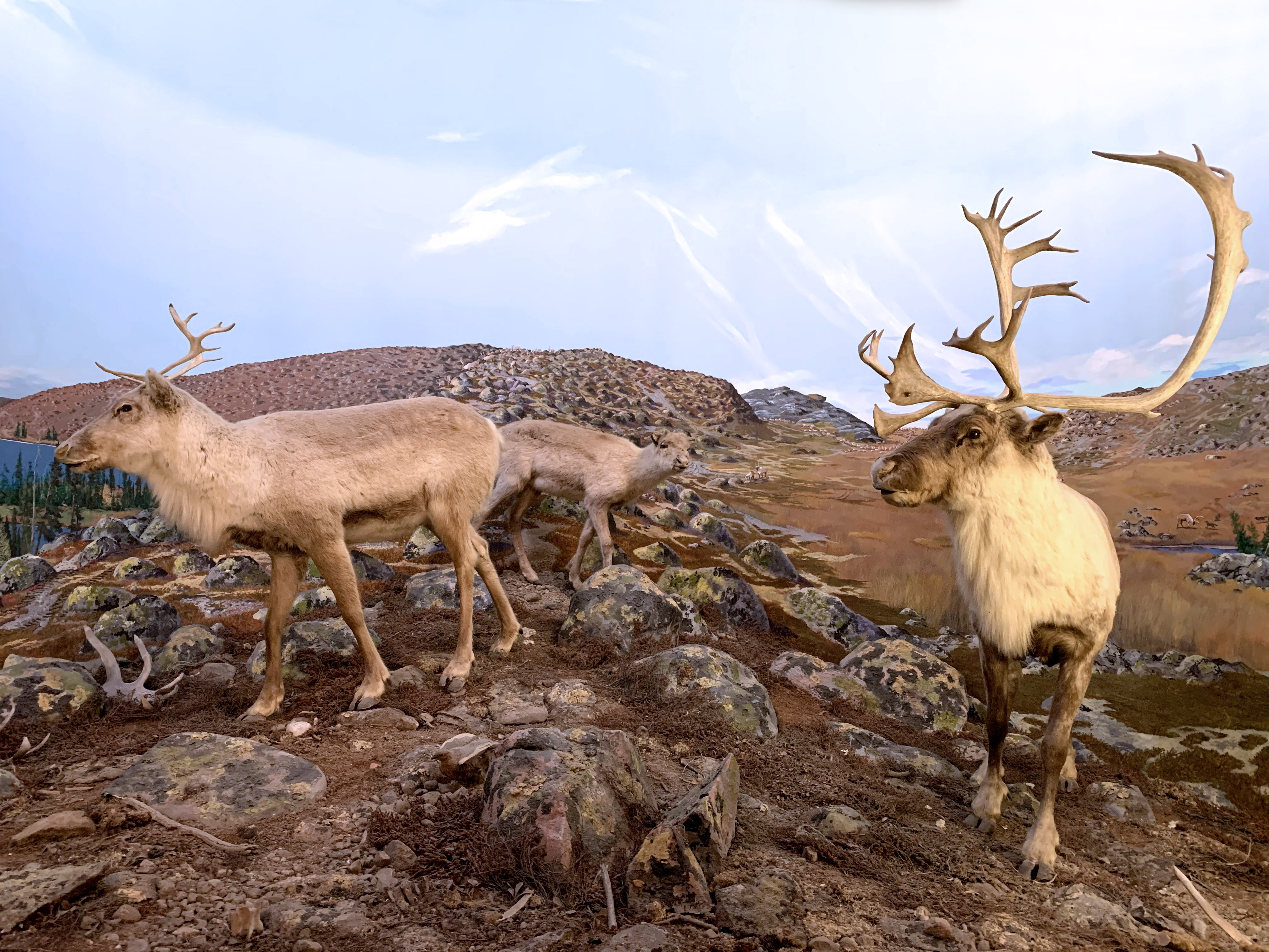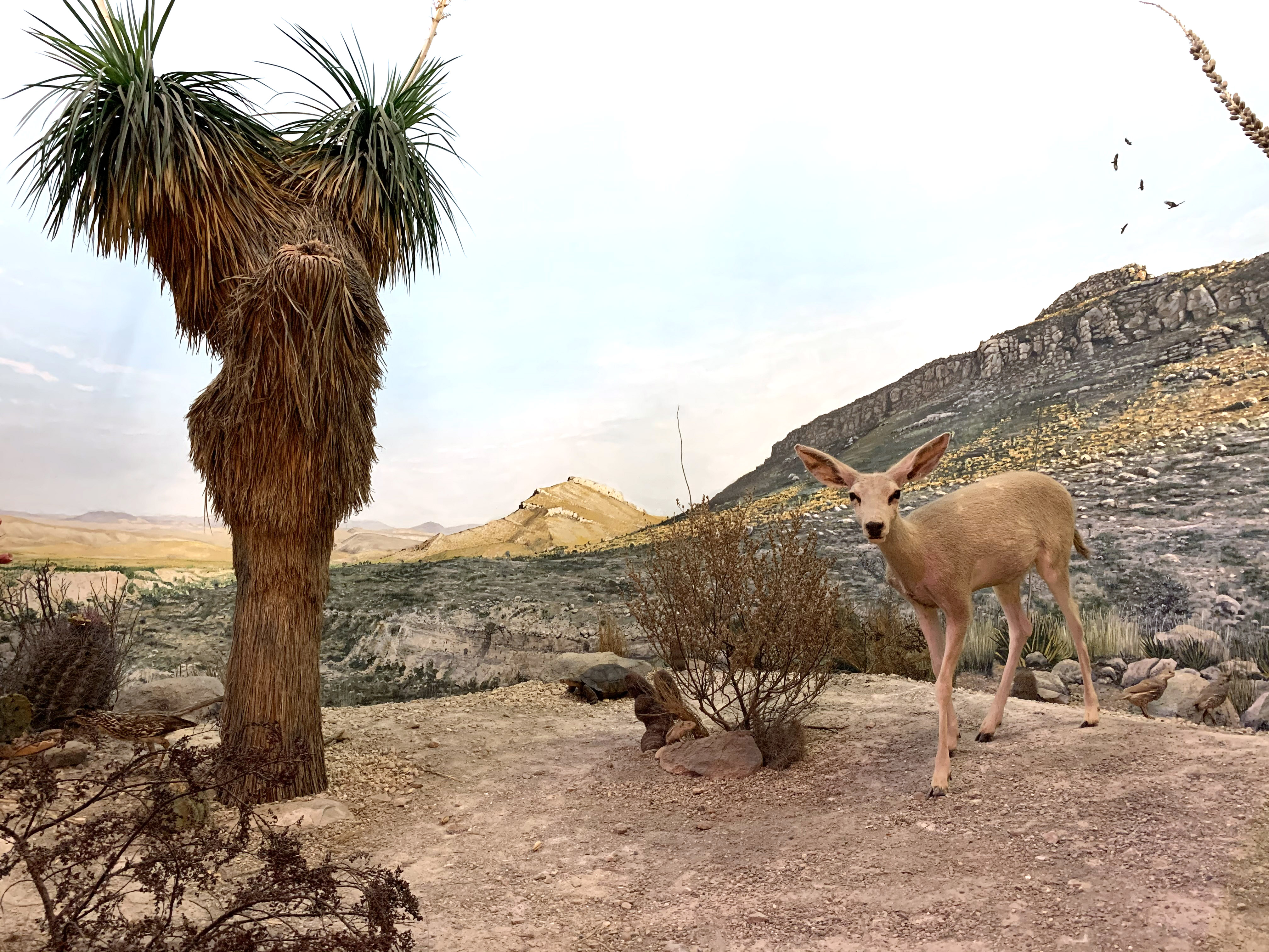 Habitat Hall features life-sized dioramas depicting the major habitats of North and Central America including forests, grasslands, deserts, tropics and the tundra. Each has hoofed mammals and other animals, showing their adaptations to the different environments. Also featured are complete, mounted articulated skeleton casts of two of the great Jurassic dinosaurs, Allosaurus and Stegosaurus, and several smaller displays related to dinosaurs.