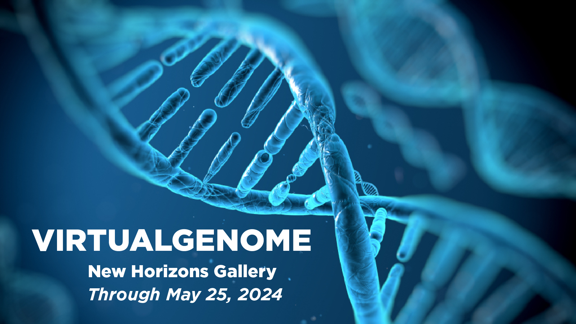 A close-up illustration of a blue DNA helix with white text that reads "VirtualGenome at the New Horizons Gallery through May 25, 2024